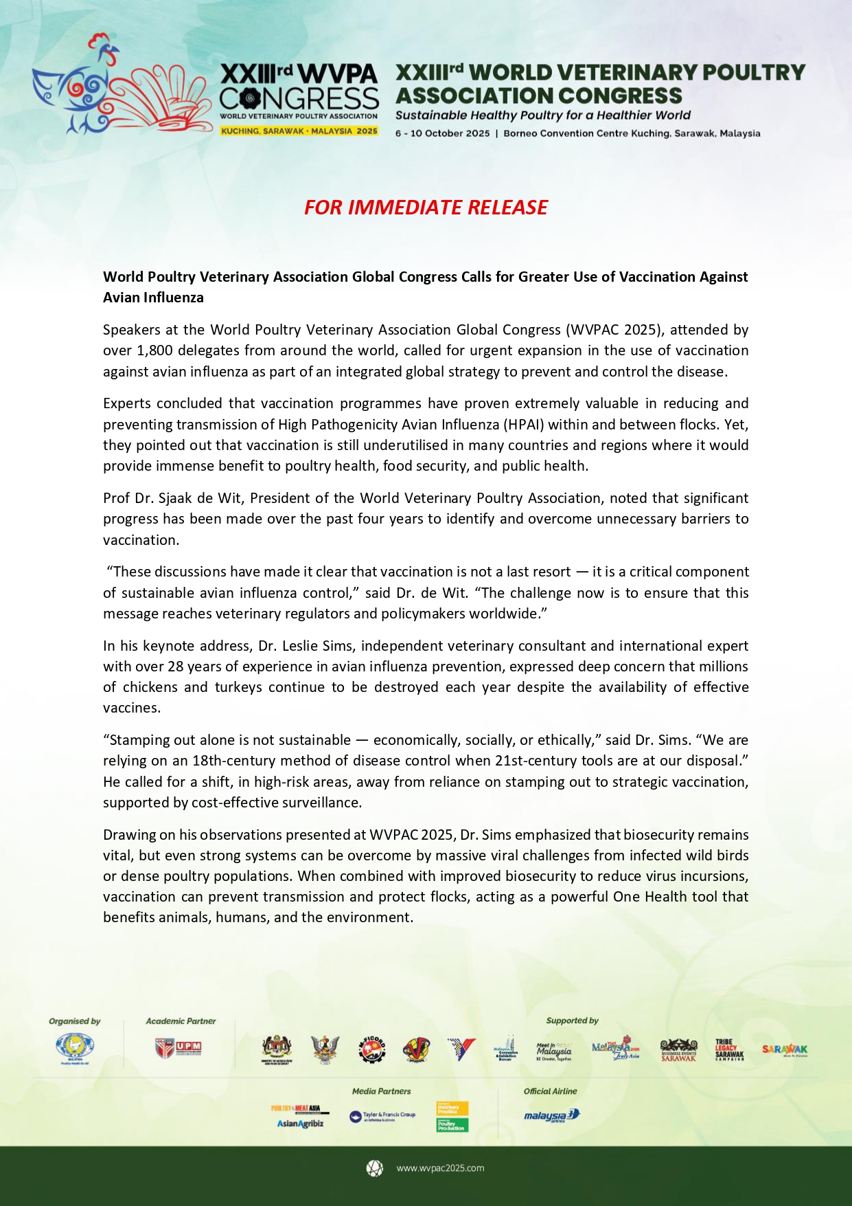 On behalf of the World Veterinary Poultry Association, I would like to thank the WVPA Malaysia branch and its partners for their excellent work and wish all participants an unforgettable event.