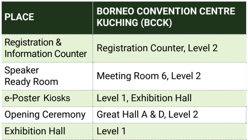 The Speaker Ready Room is located at Meeting Room 6, Level 2, Borneo Convention Centre Kuching. All speakers and oral presenters are required to upload their presentation slides (.ppt format) at least four (4) hours before their scheduled session(s). For morning sessions, materials should be submitted the day before. All presentation files uploaded in the Speaker Ready Room will be automatically transmitted to the podium laptop in the assigned session room ahead of the presentation. Personal laptops are not permitted. The opening hours are as below: