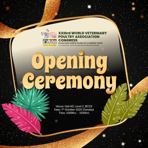 Be part of the official launch that sets the stage for an inspiring week of knowledgesharing, presentations, and discussions on the latest in poultry health and production. All delegates are warmly invited to attend this special occasion, where we come together to mark the beginning of WVPAC 2025 in the vibrant city of Kuching.