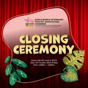 The Closing Ceremony marks the conclusion of WVPAC 2025. It is a moment to reflect on the congress achievements, celebrate the scientific and professional exchanges, and express appreciation to everyone who made the Congress a success. During this event, we shall welcome and congratulate the country that will host the next WVPA Congress in 2027. Join us as we wrap up a memorable week and look ahead to the future of poultry health and production worldwide.